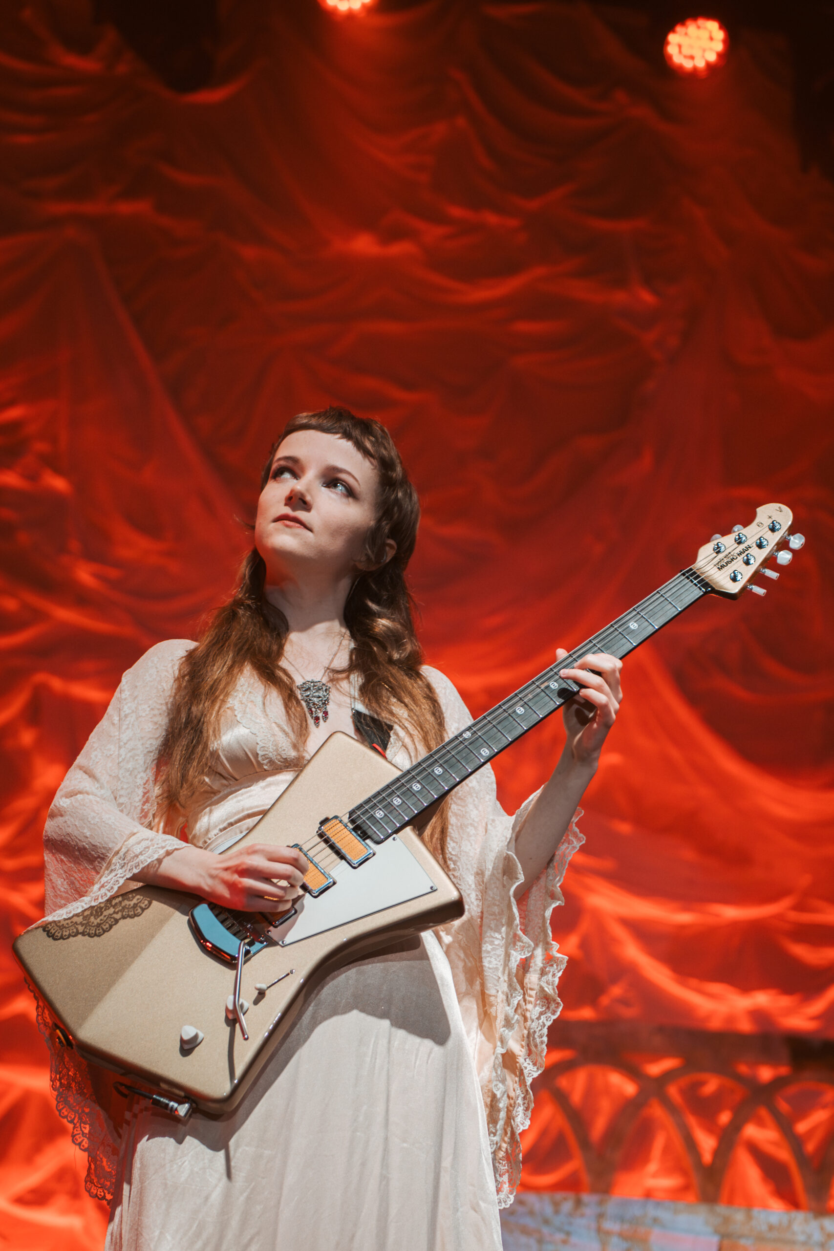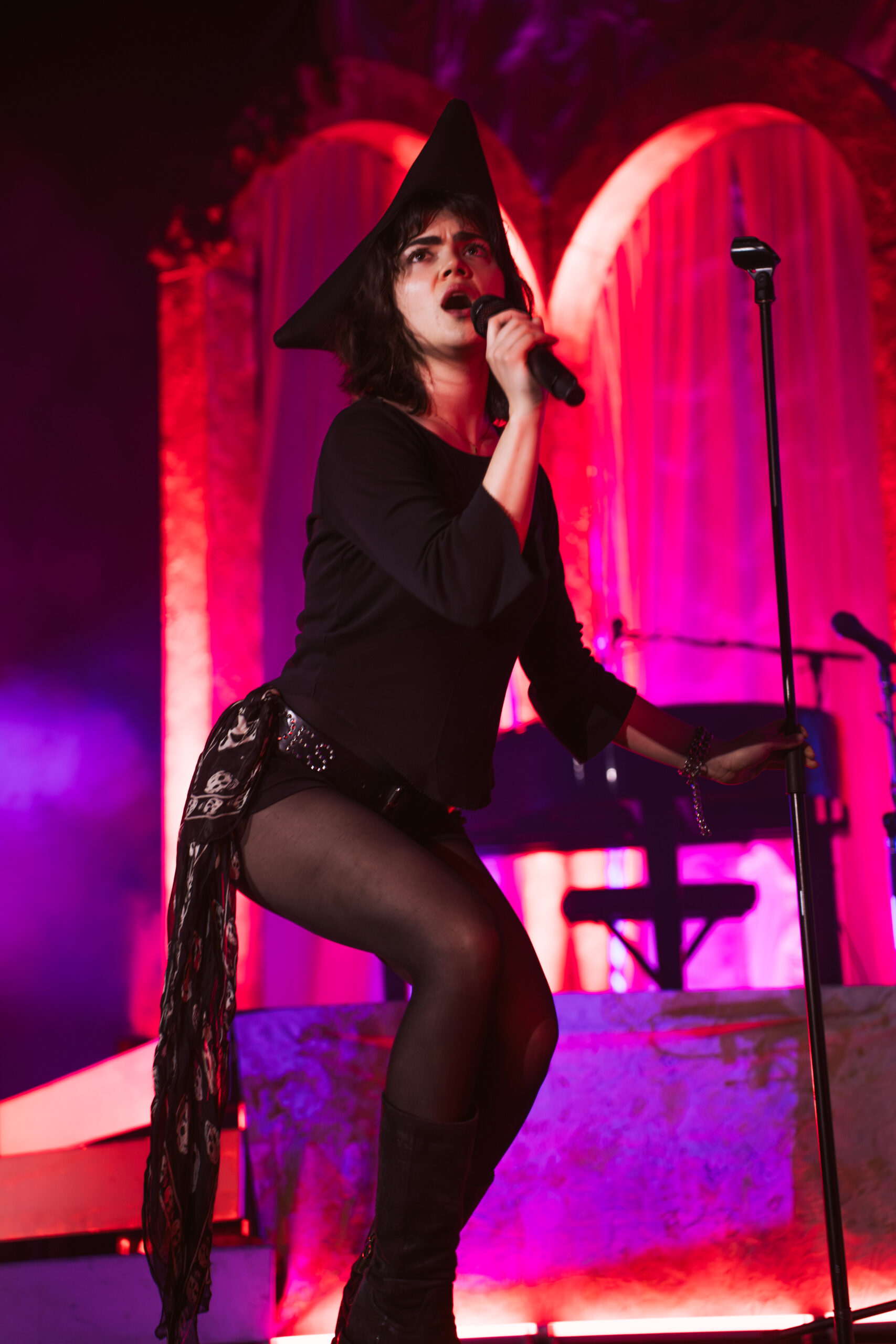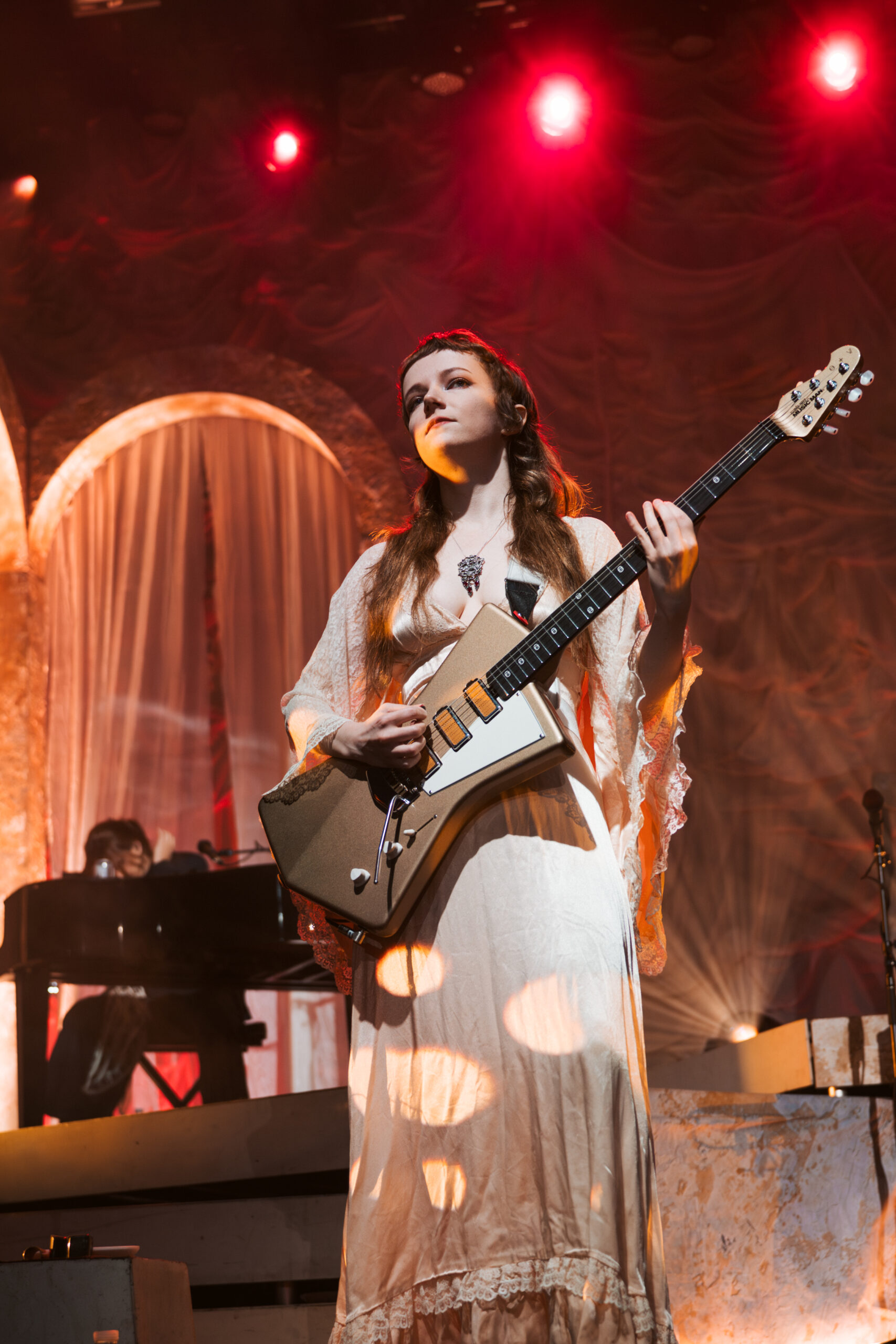 The band’s performance is very reminiscent of a theater show, with elaborate set design, melodies, and songwriting that would fit right in as a production in London’s West End. Each song is written and performed in such a theatrical way, enhancing Morris’ naturally incredible stage presence. Continuing the theatrical feel, one audience member held a sign that said “Participate in 24-hour Shakespeare,” with Sonnet 115 written on the back for Abigail to read. The fan asked her to help with a challenge to read every Shakespeare play and sonnet in 24 hours. Her line delivery was so spot-on and beautiful that I was surprised to learn she was never a theater kid.