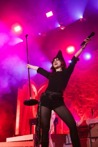 With their partnership with Ribbons for Provisions to end world hunger, a booth to help you sign up to vote, and the lead singer stopping to promote a fan’s chain mail armor business after seeing her sign in the crowd, The Last Dinner Party is certainly successful in blending theatrics with the Riot Grrrl inspired style.